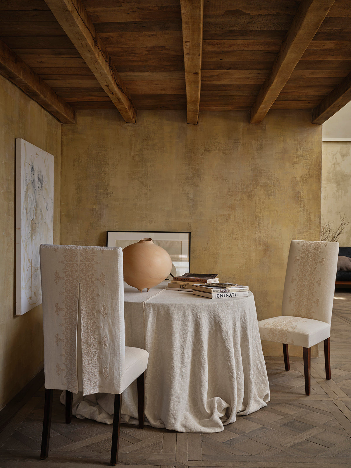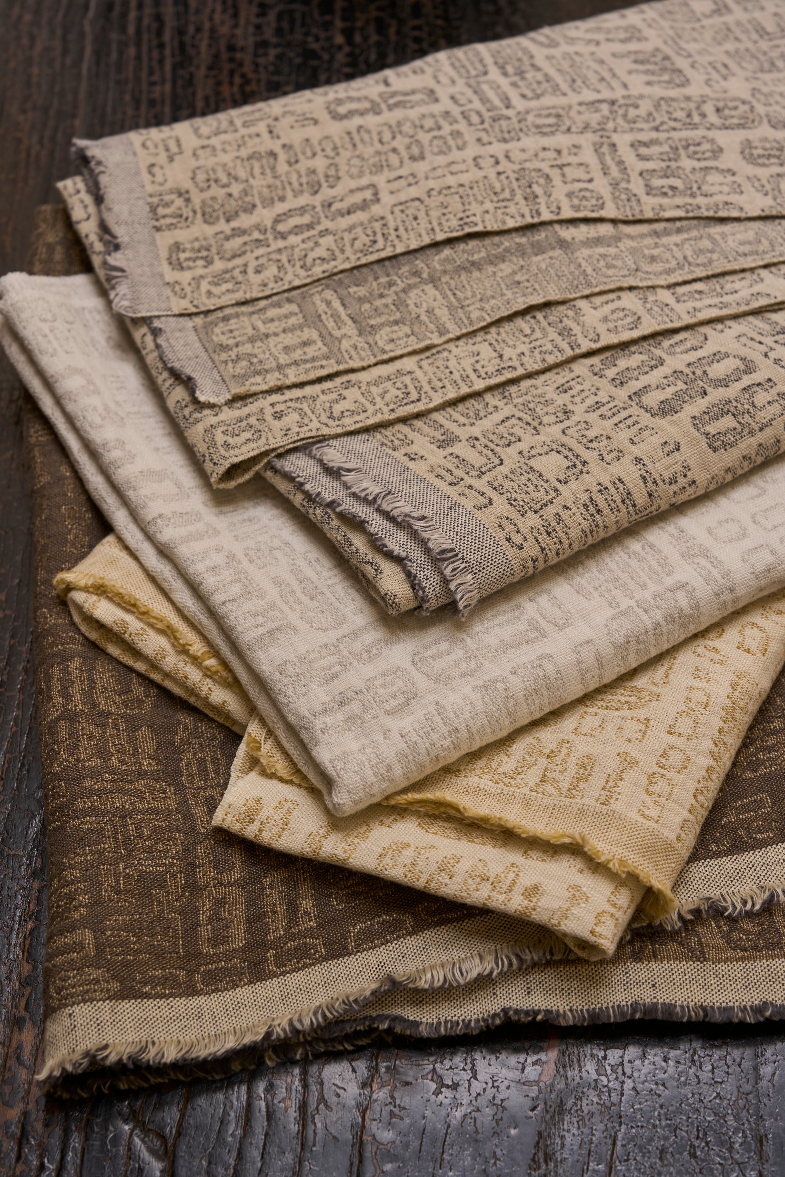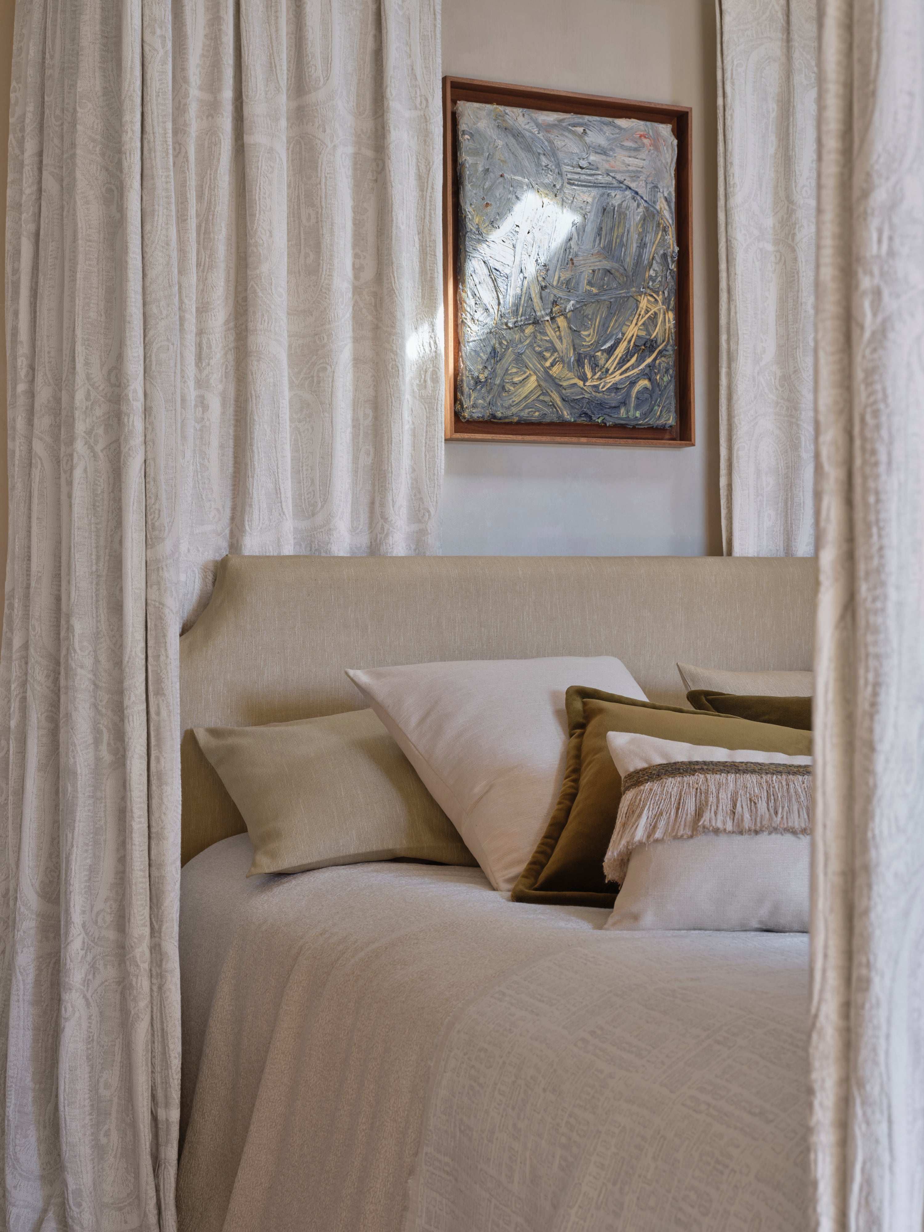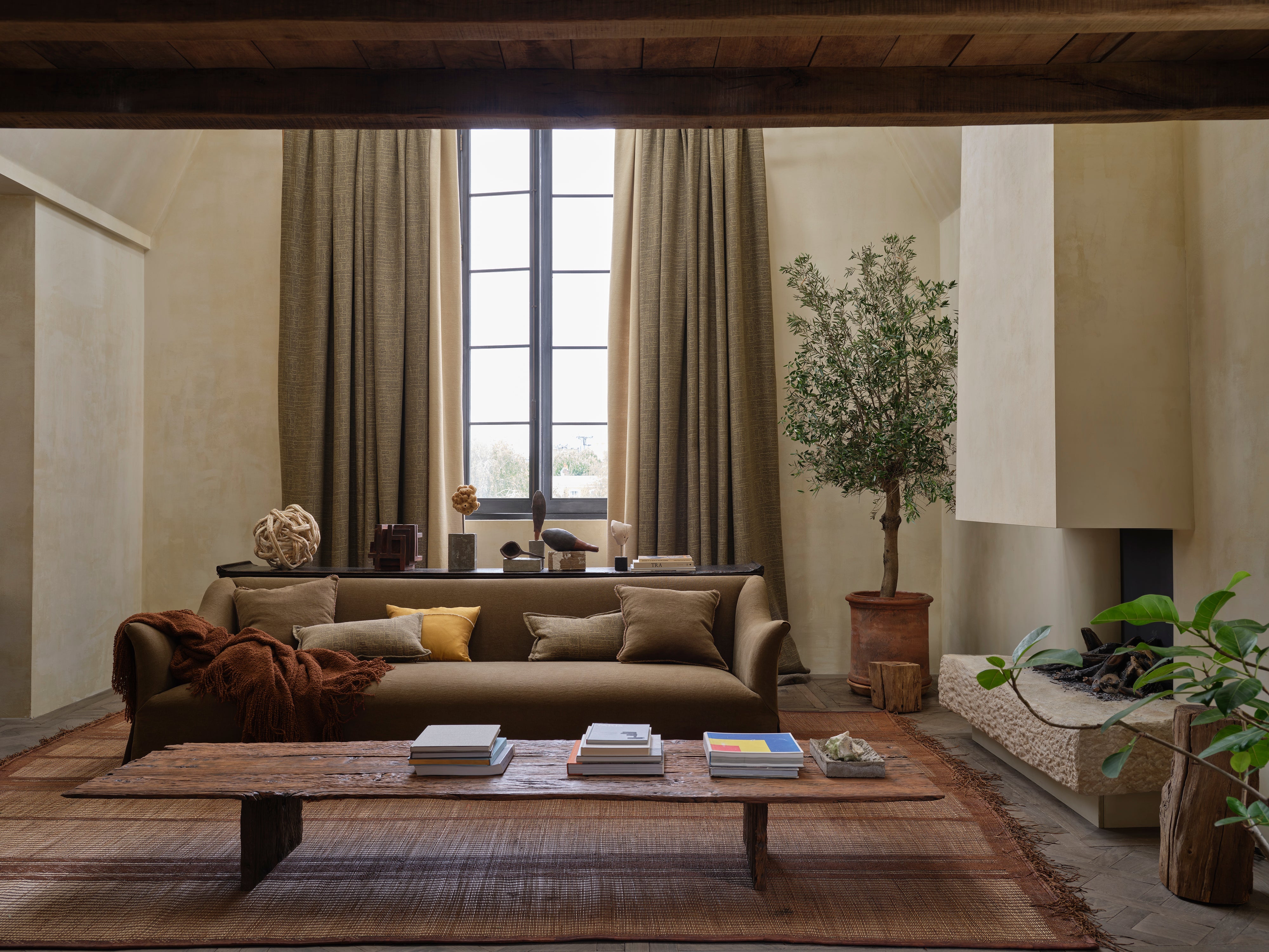 de Le Cuona fabrics—TAN2 and V4—styled in a refined interior with layered textures and natural color palette.