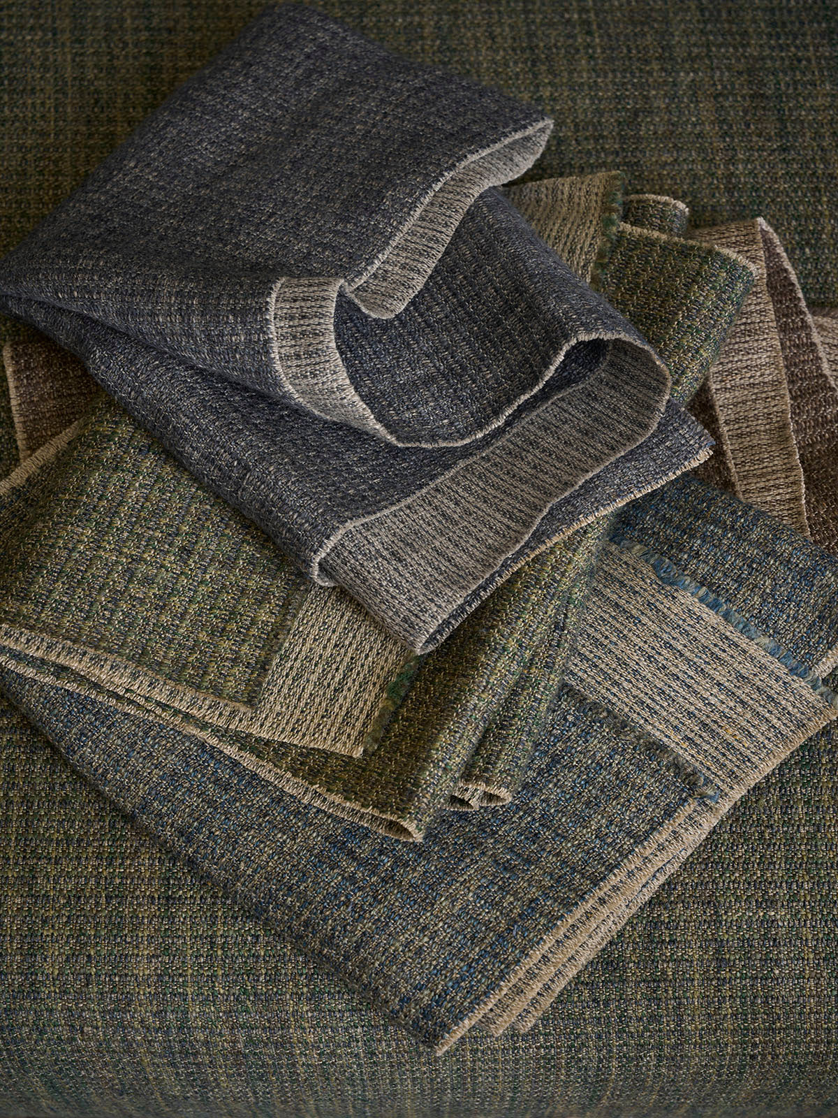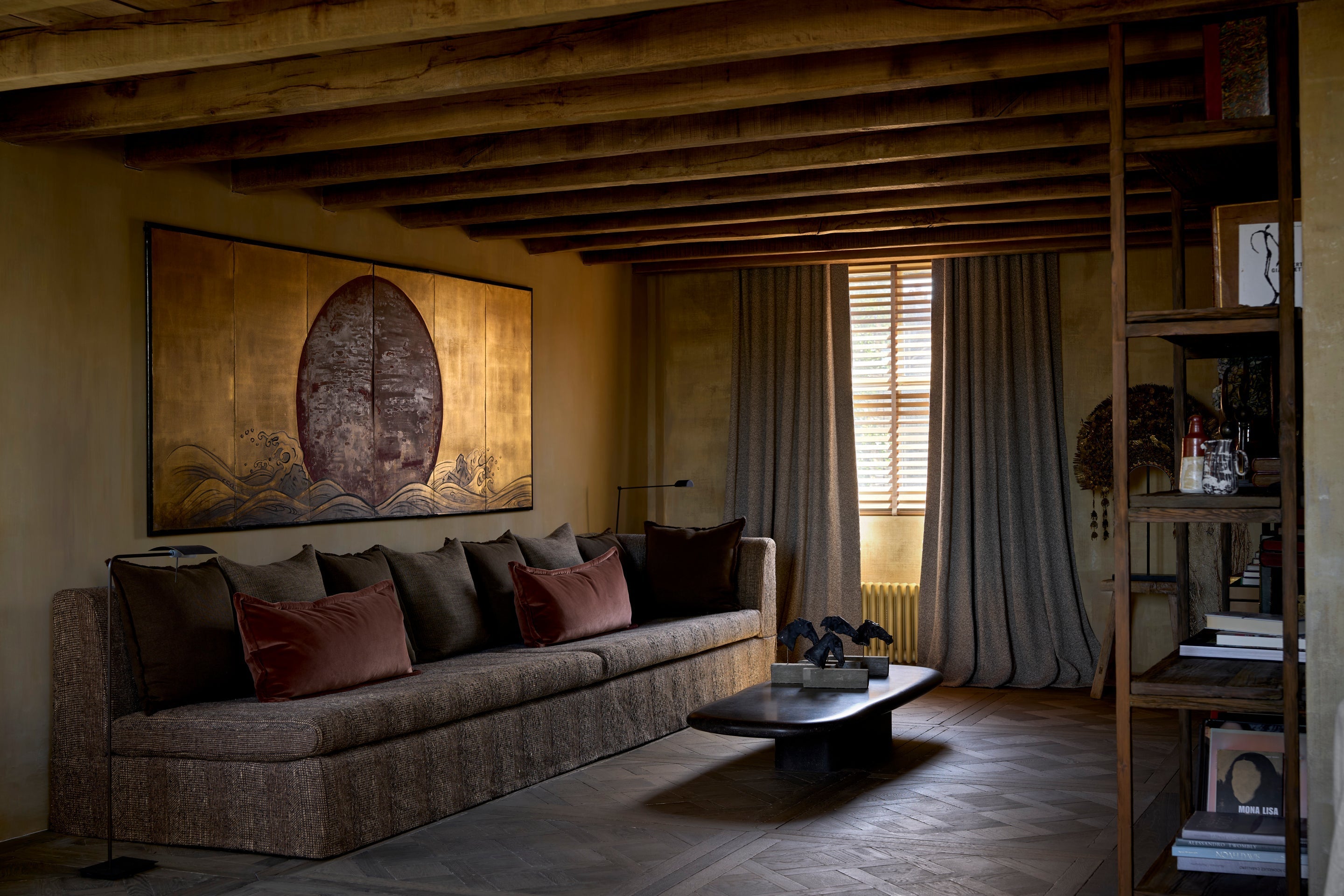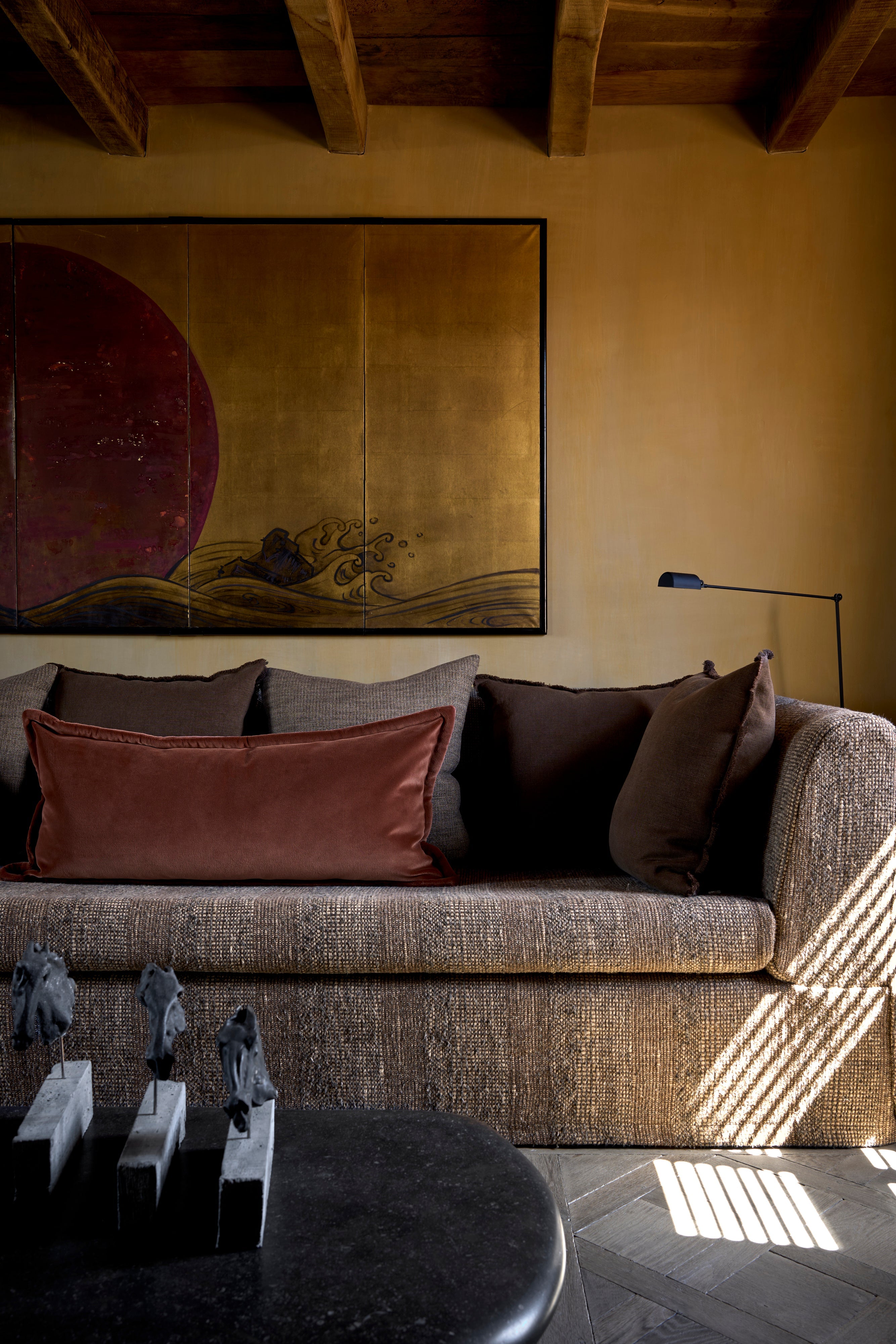 de Le Cuona fabrics—TAN2 and V4—styled in a refined interior with layered textures and natural color palette.