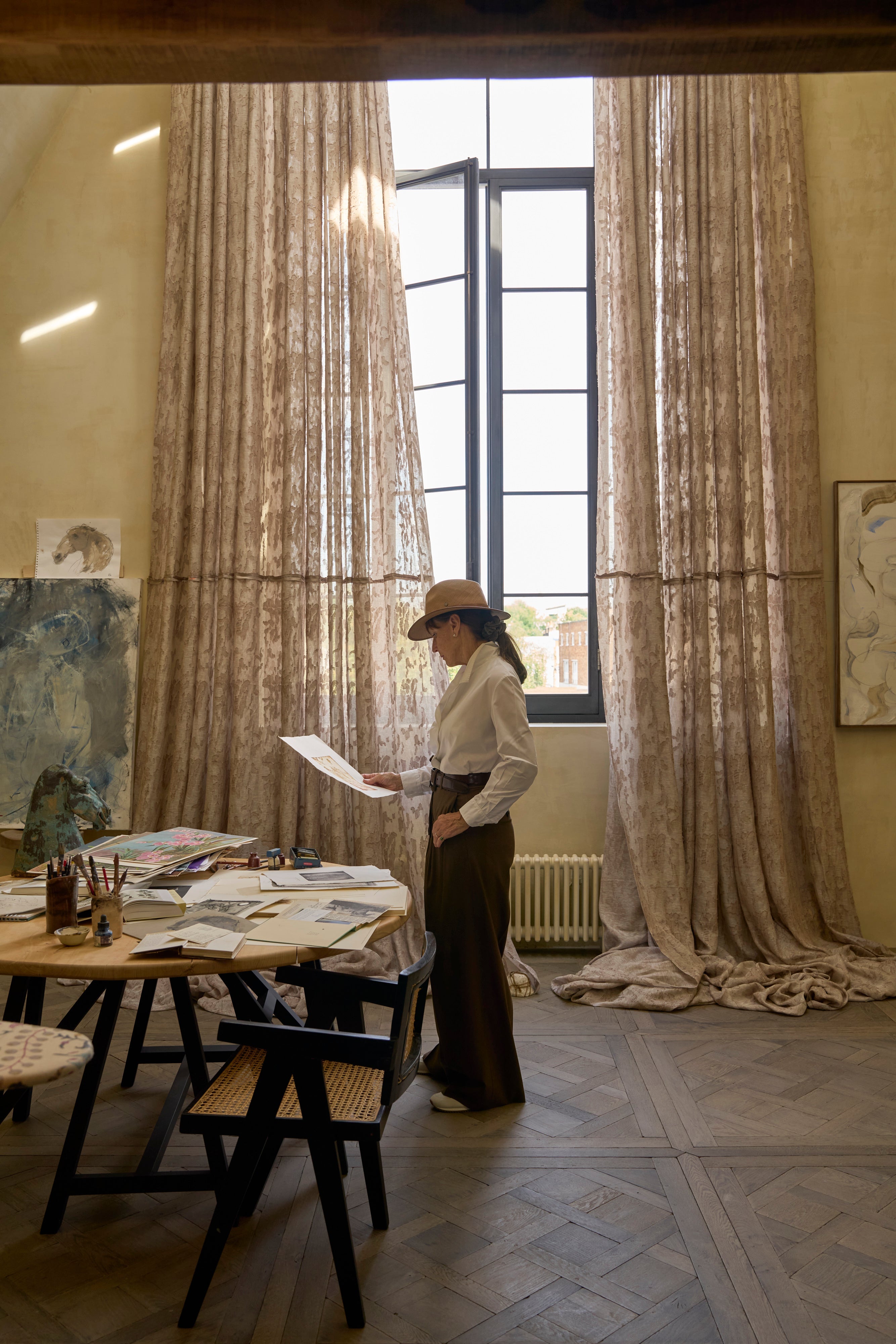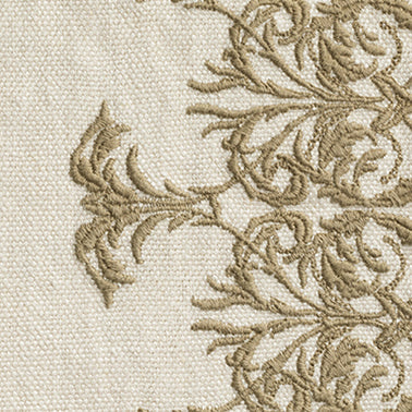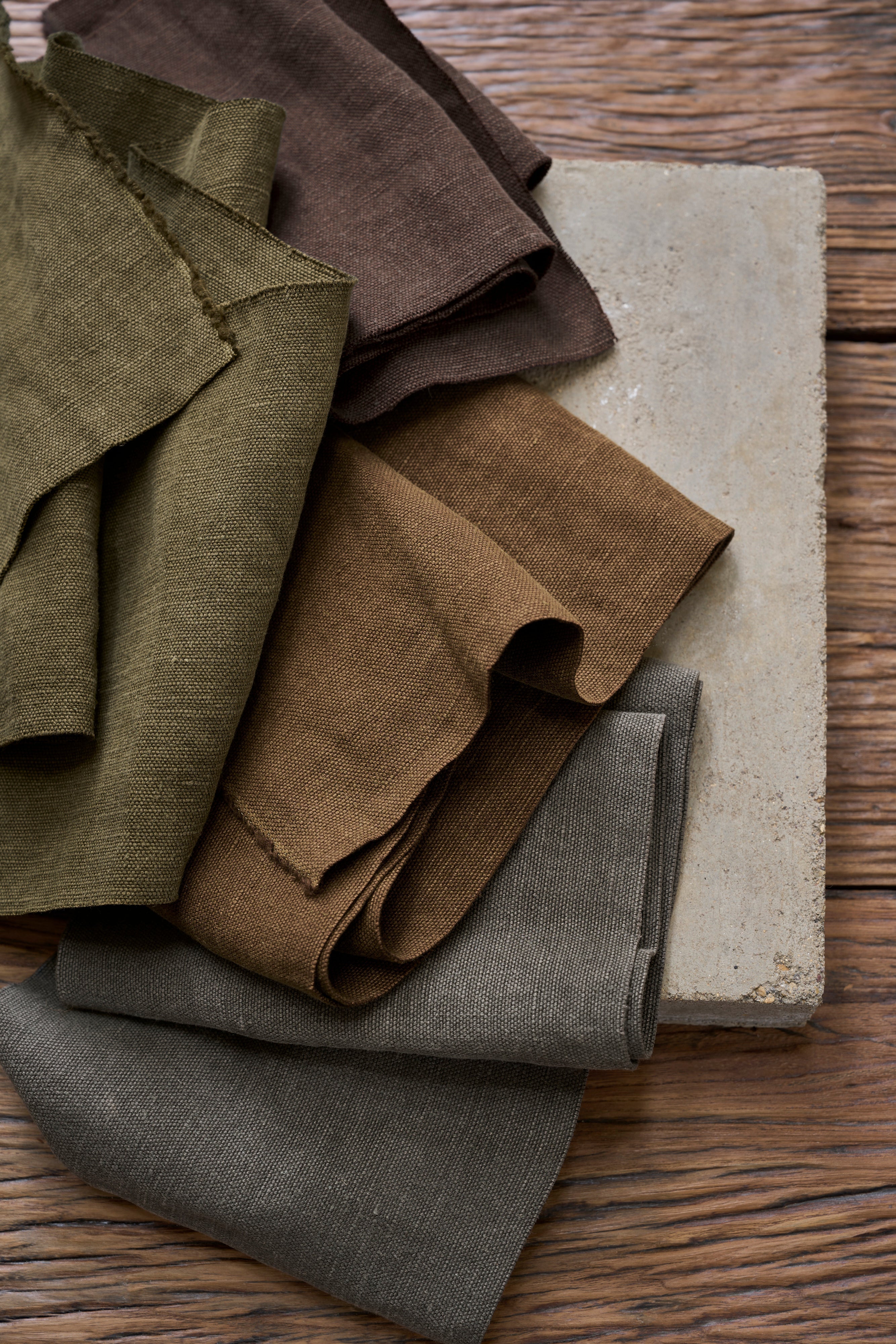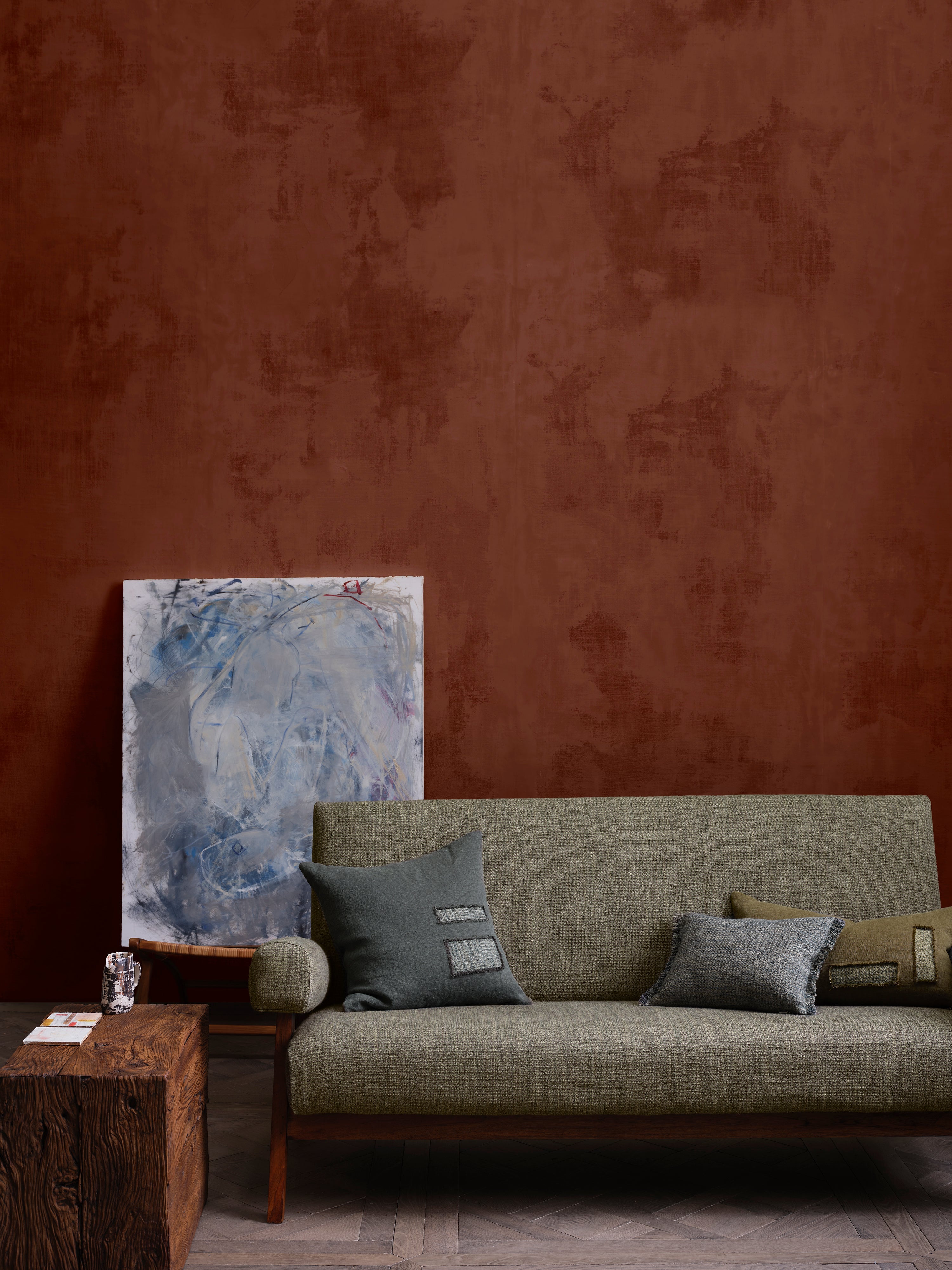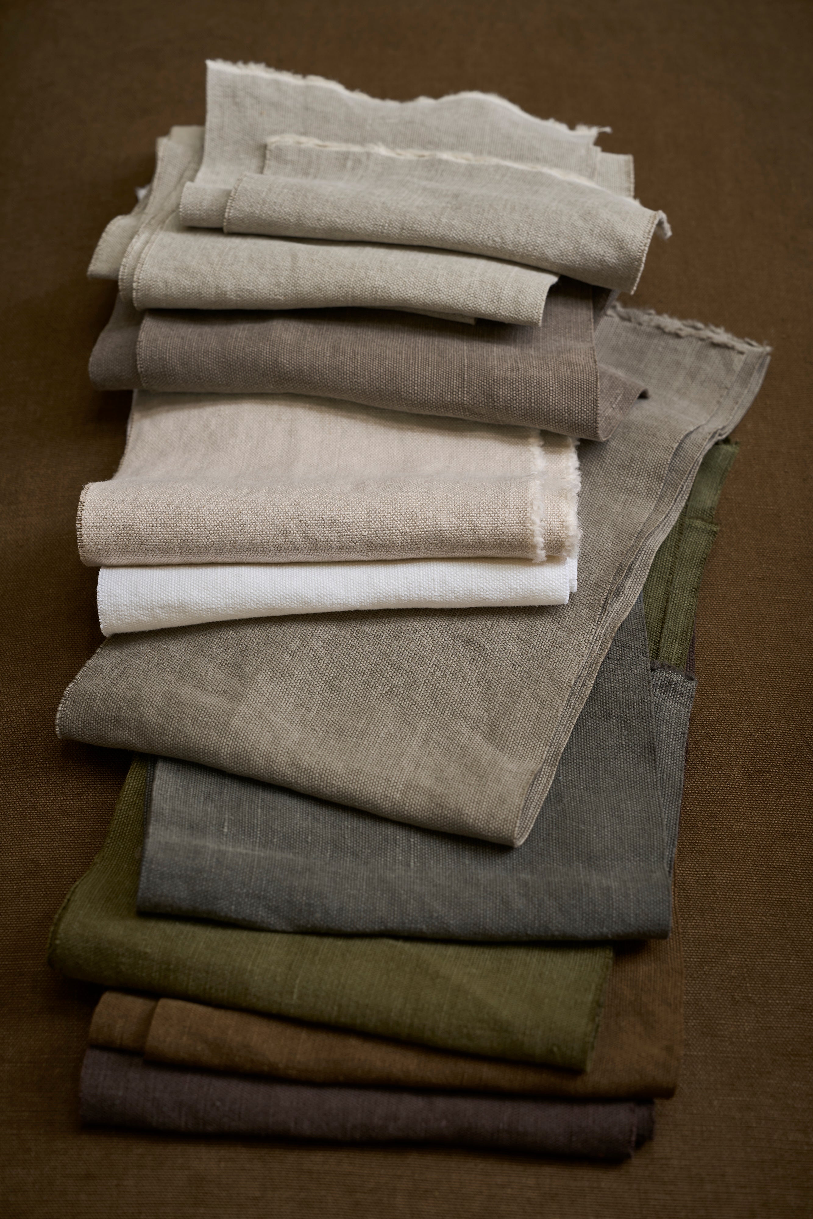 de Le Cuona fabrics—TAN2 and V4—styled in a refined interior with layered textures and natural color palette.