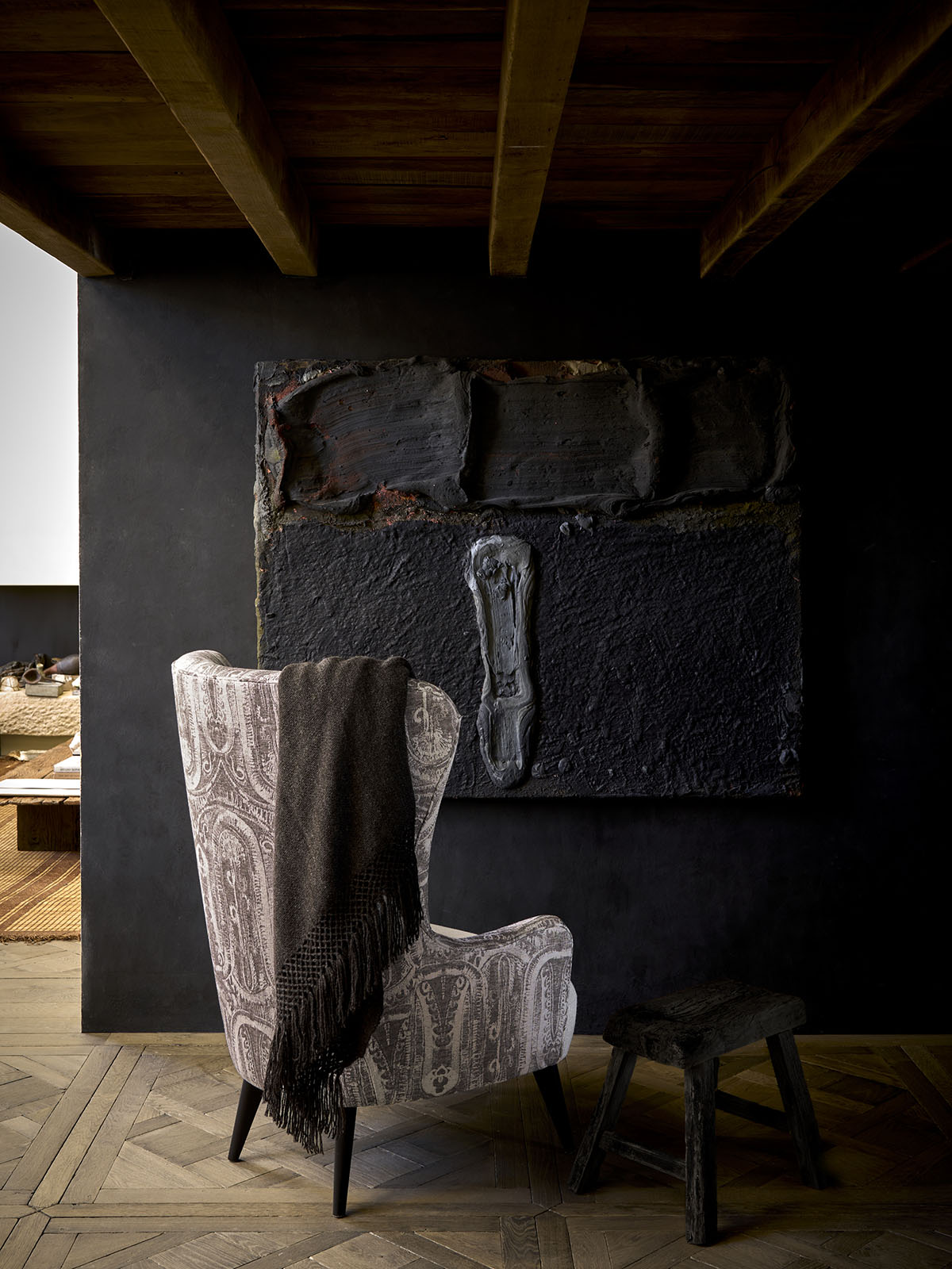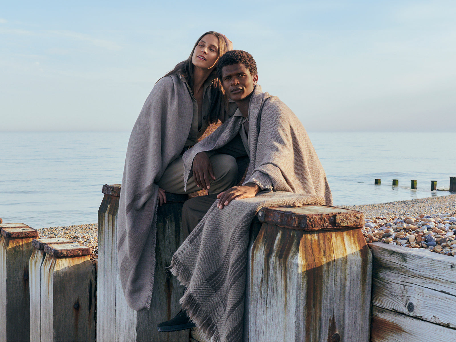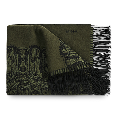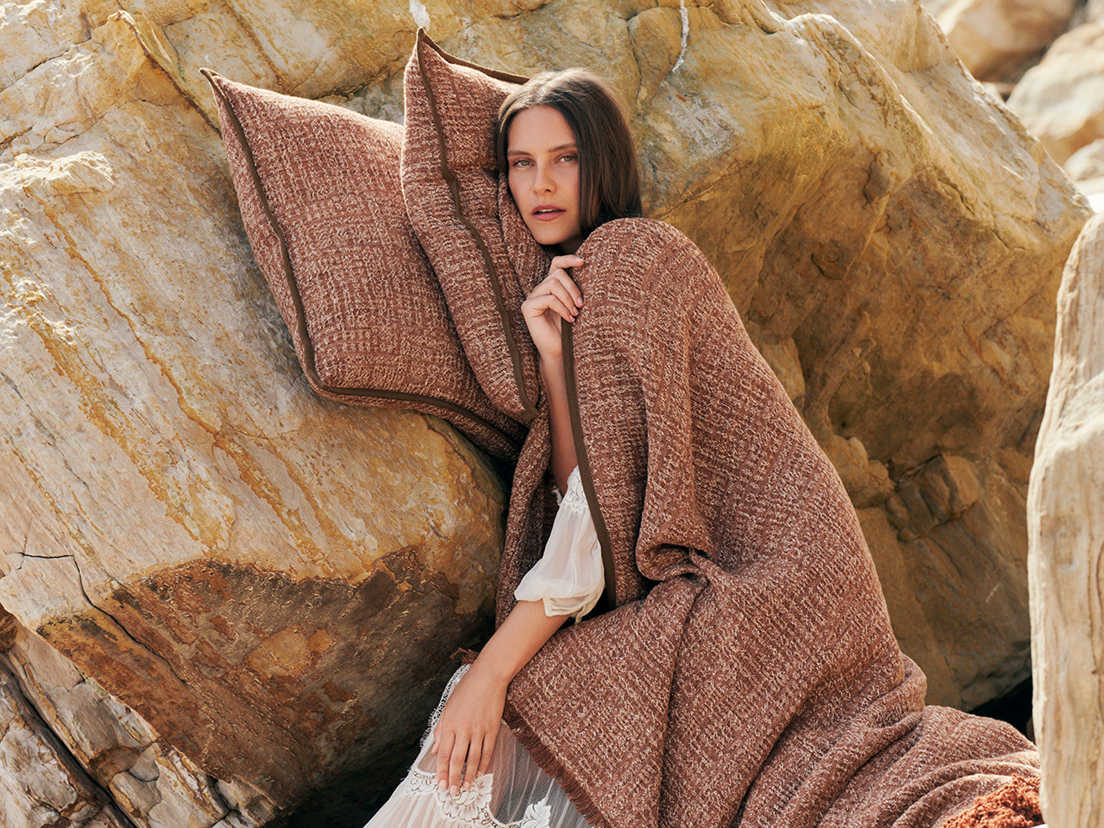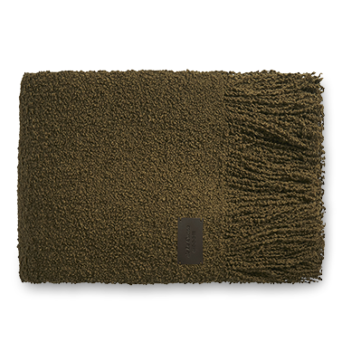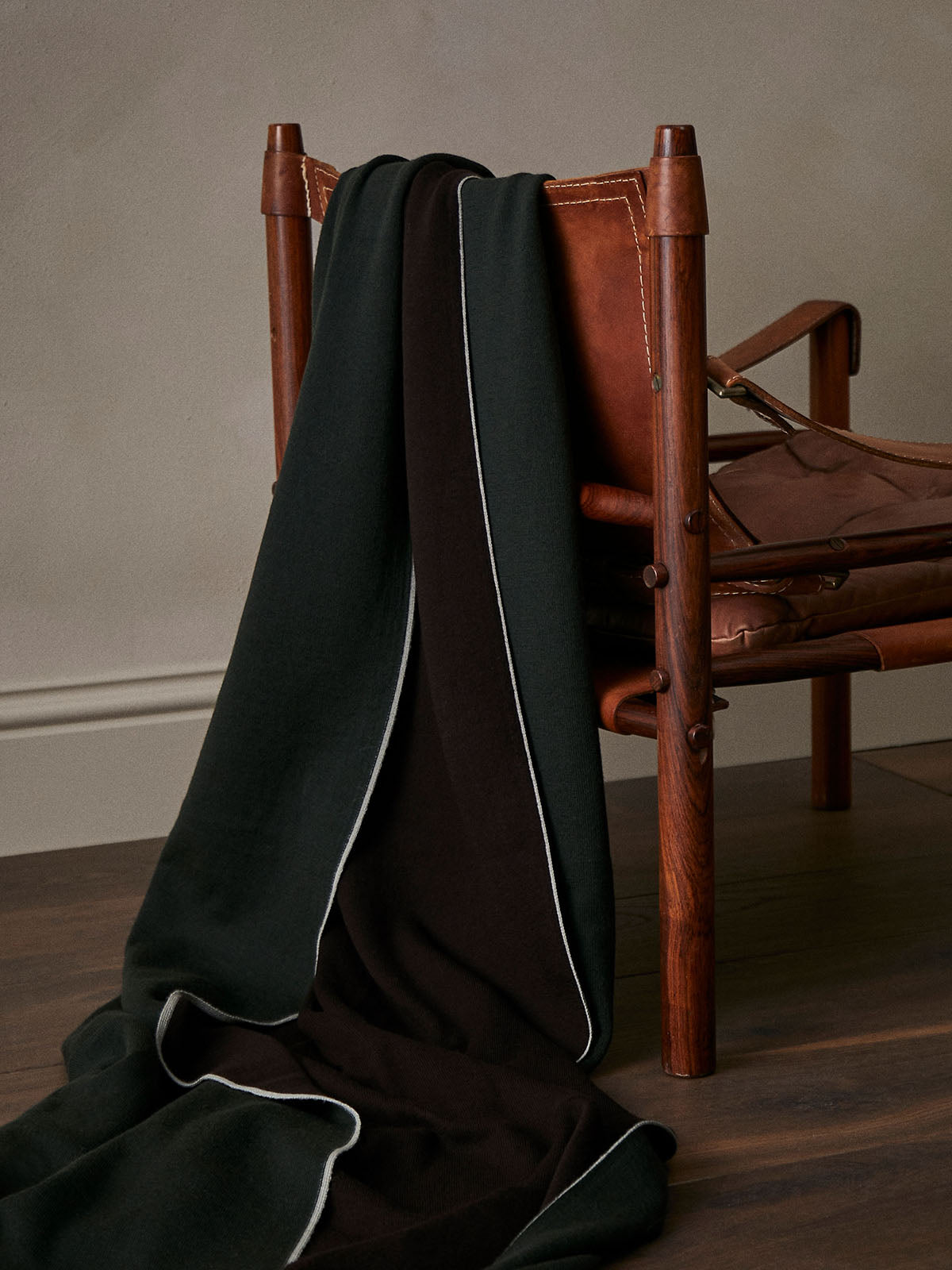 de Le Cuona Samurai River throw blankets in Truffle and Moss—luxury layered textiles styled for warmth and elegance.