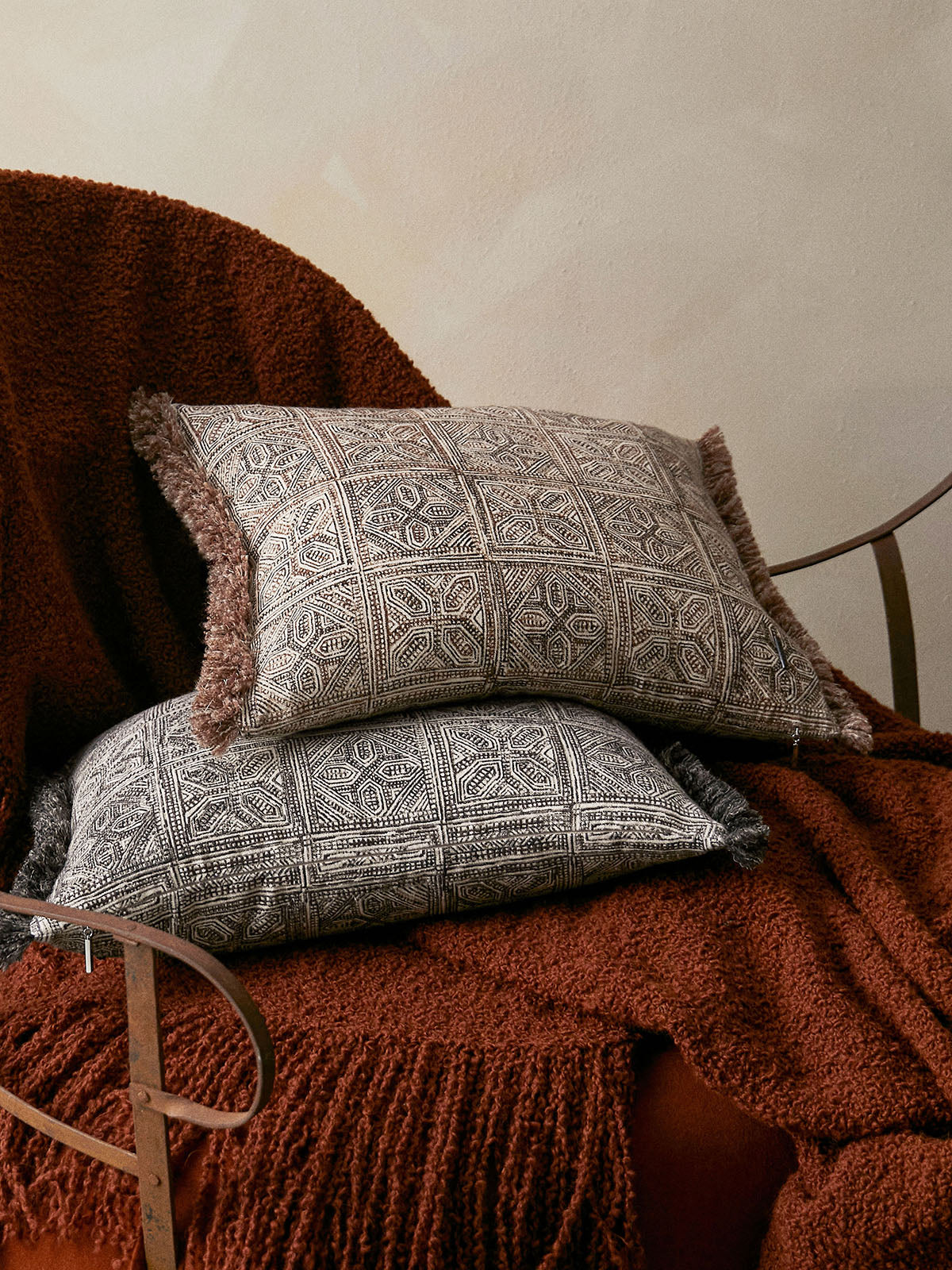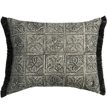 BATIK BLOCK PRINT CUSHION WITH FRINGING IN CHARCOAL