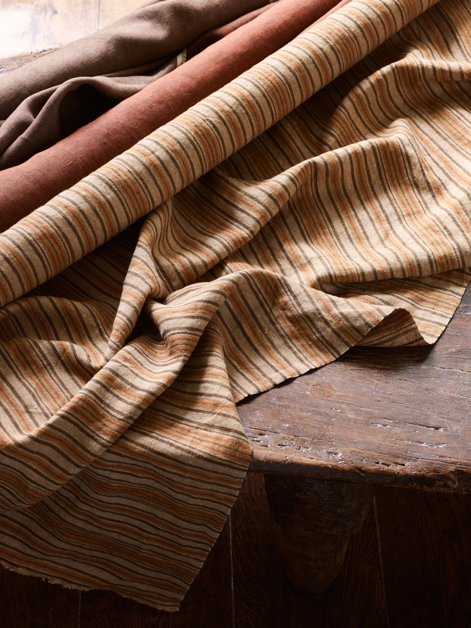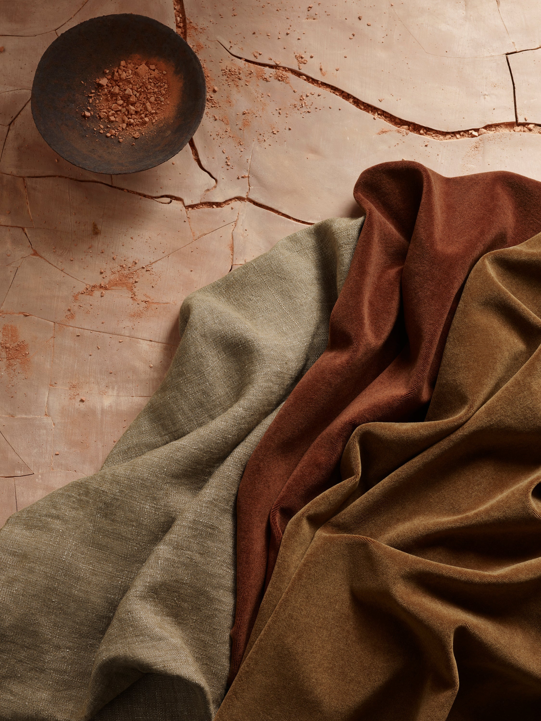 Nurturing malty neutrals sit alongside hot shots of terra rossa in the Tera Firma collection. Forage Cloth is a linen and wool in soft earthy pigments. Merino Velvet includes saturated hues inspired by the abundance of the natural world including autumn Maple and ripe Damson.