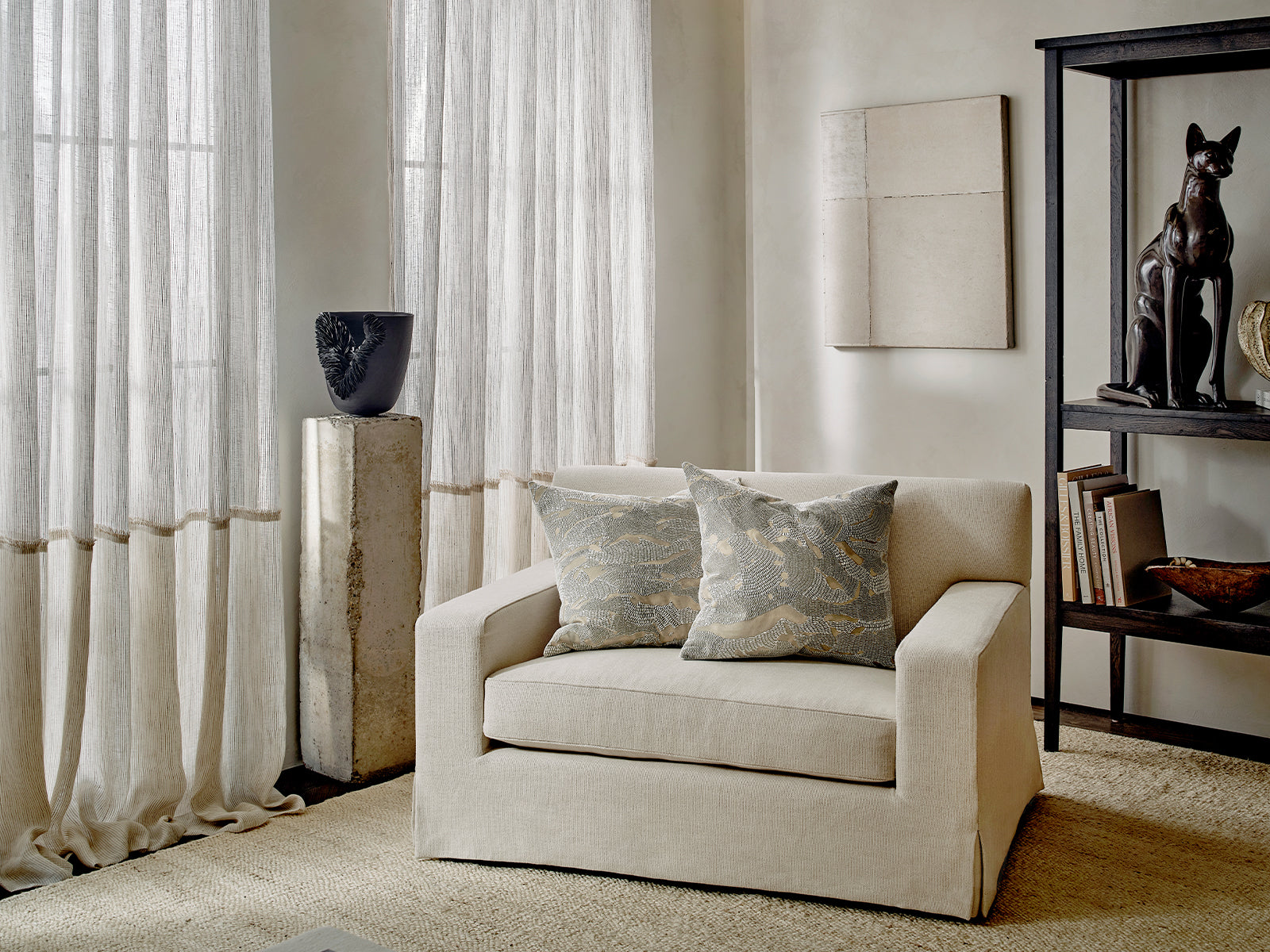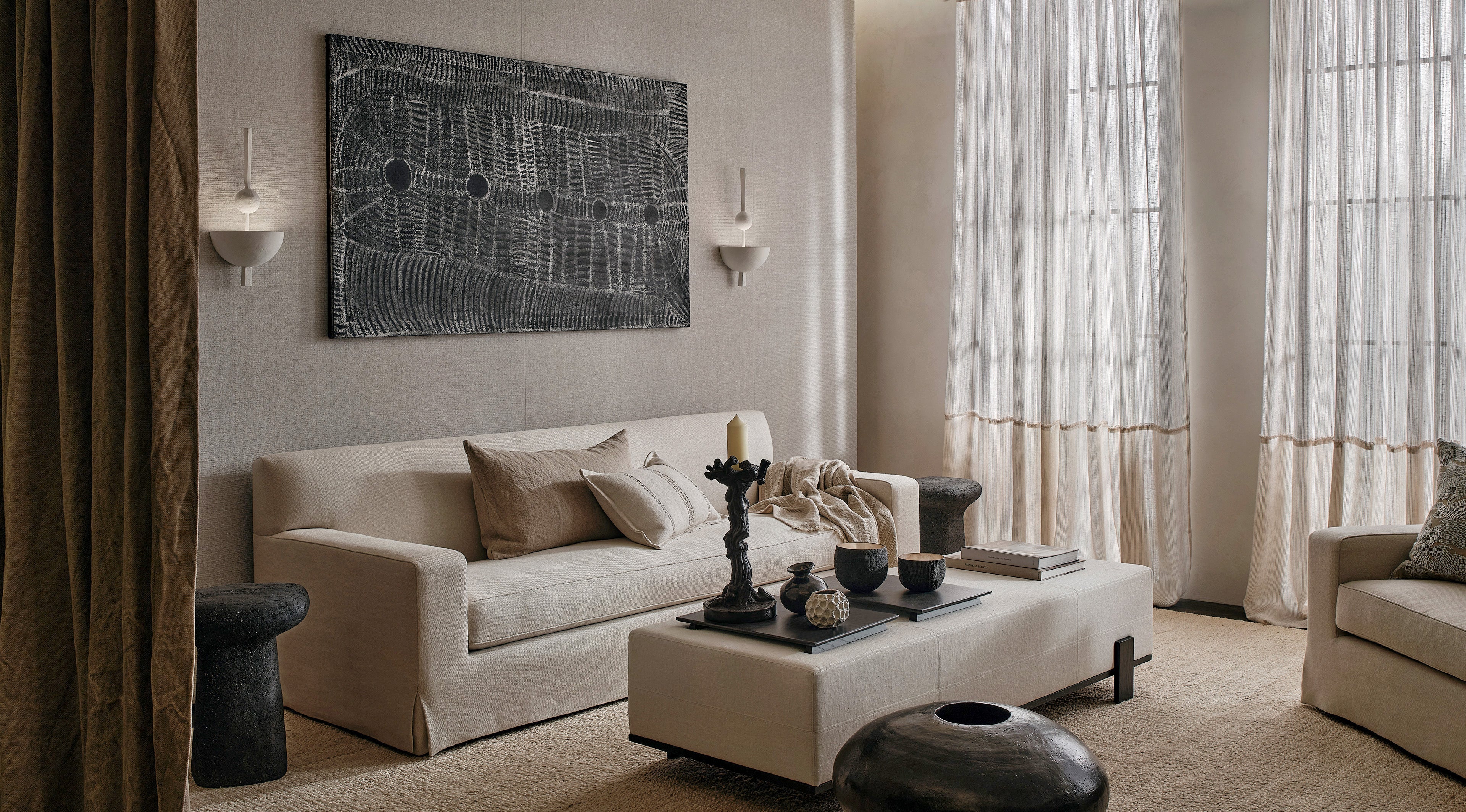 de Le Cuona ‘Buffalo Dust’ bespoke unlined linen curtains, and bespoke double sheer curtains with eyelash detail in ‘Pure Atlas Kyoto’ and ‘Pure Atlas Mahé’.