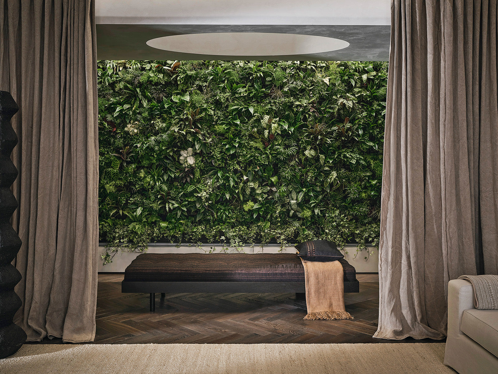 de Le Cuona uses only the finest natural fibres for its fabrics and the introduction of Pure 100% organic GOTS certified linen is a landmark in the industry. The living room is dressed indifferent weights of linen from the soft feature walling and invitingly tactile upholstery to the drapes that pool on the oak floor and frame the greenery in the vertical living wall.