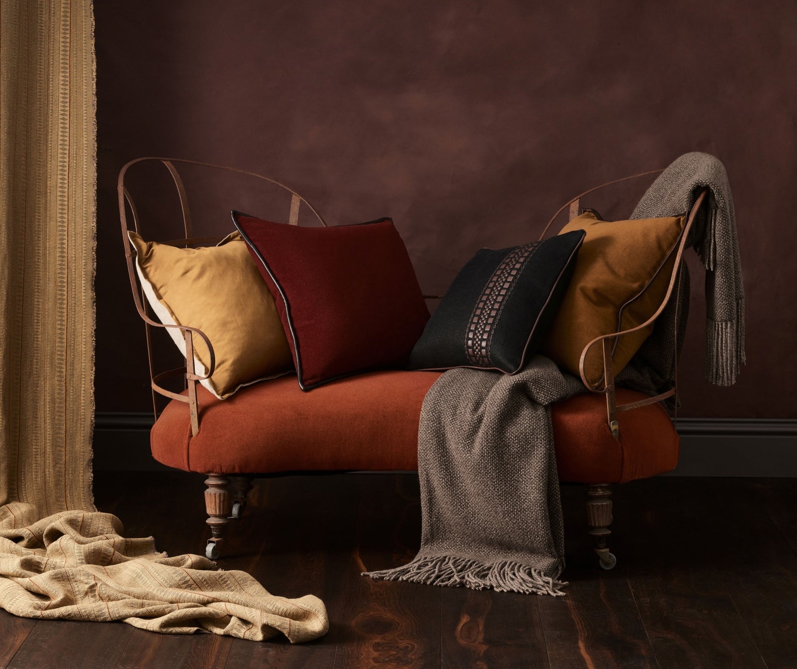 Hand crafted accessories explore the world of the senses. Textures are layered, colours combined, and intricate detailing applied to create unique cushions and throws. Each piece is made in Britain from de Le Cuona’s exquisite natural fabrics.